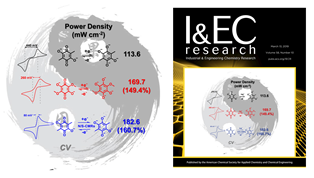 (2)通过分子结构设计,减小分子HOMO-LUMO轨道能量差距,利用低成本催化剂,增强了电解质分子的氧化还原反应动力学,将液流电池的峰值功率密度提高160%以上。成果入选I&EC封面。(Ind. Eng. Chem Res, 2019, 58, 3994)