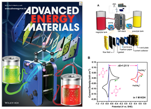 (3)通过分子结构设计,开了基于苯醌的低成本、高储能性能的水系有机液流电池,成果入选Adv. Energy Mater.内封面。(Adv. Energy Mater. 2017, 1702056)
