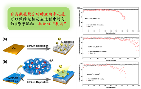 (2)自具微孔聚合物的亚纳米通道,可以“引导”Li+离子在电极表面均匀沉积,抑制Li金属电池“枝晶”形成。(Chemistry - A European Journal, 2019, 25(52): 12052-12057, VIP Paper)