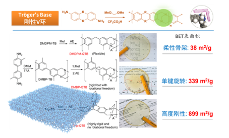 (1)利用Tröger’s Base结构中V型的刚性结构,阻碍聚合物链段堆积,首次制备了系列自具微孔离子膜。在离子交换容量仅为 0.82 mmol/g时,DMBP-QTB膜的OH-电导率可高达164.4 mS/cm。(Angew. Chem. Int. Ed., 2016, 55, 11499)
