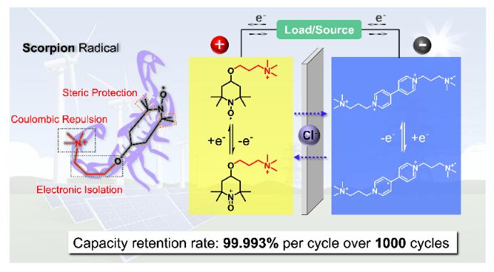 (1)利用电荷排斥、空间位阻并分离荷电基团,开发了基于氮氧自由基(TMAP-TEMPO)和紫罗碱的高稳定水系全有机液流电池,电池电压1.1V,库伦效率>99.7%,1000圈容量保持率达99.993%。(Chem, 2019, 5:1)