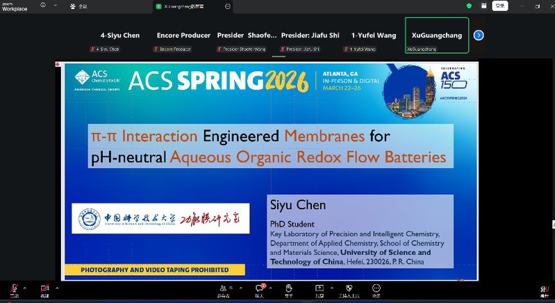 2026年3月22日至26日,美国化学会(ACS)主办的2026年春季年会(ACS Spring 2026)如期召开。中国科大功能膜研究室2025级博士生陈思宇,在工业与工程化学分会(Division of Industrial & Engineering Chemistry)下设的“亚太地区工业与工程化学研究生研讨会”(Virtual Graduate Students Symposium in Asia-Pacific Region on Industrial & Engineering Chemistry)专题会场受邀作线上口头报告,并凭借出色表现荣获优秀口头报告奖。